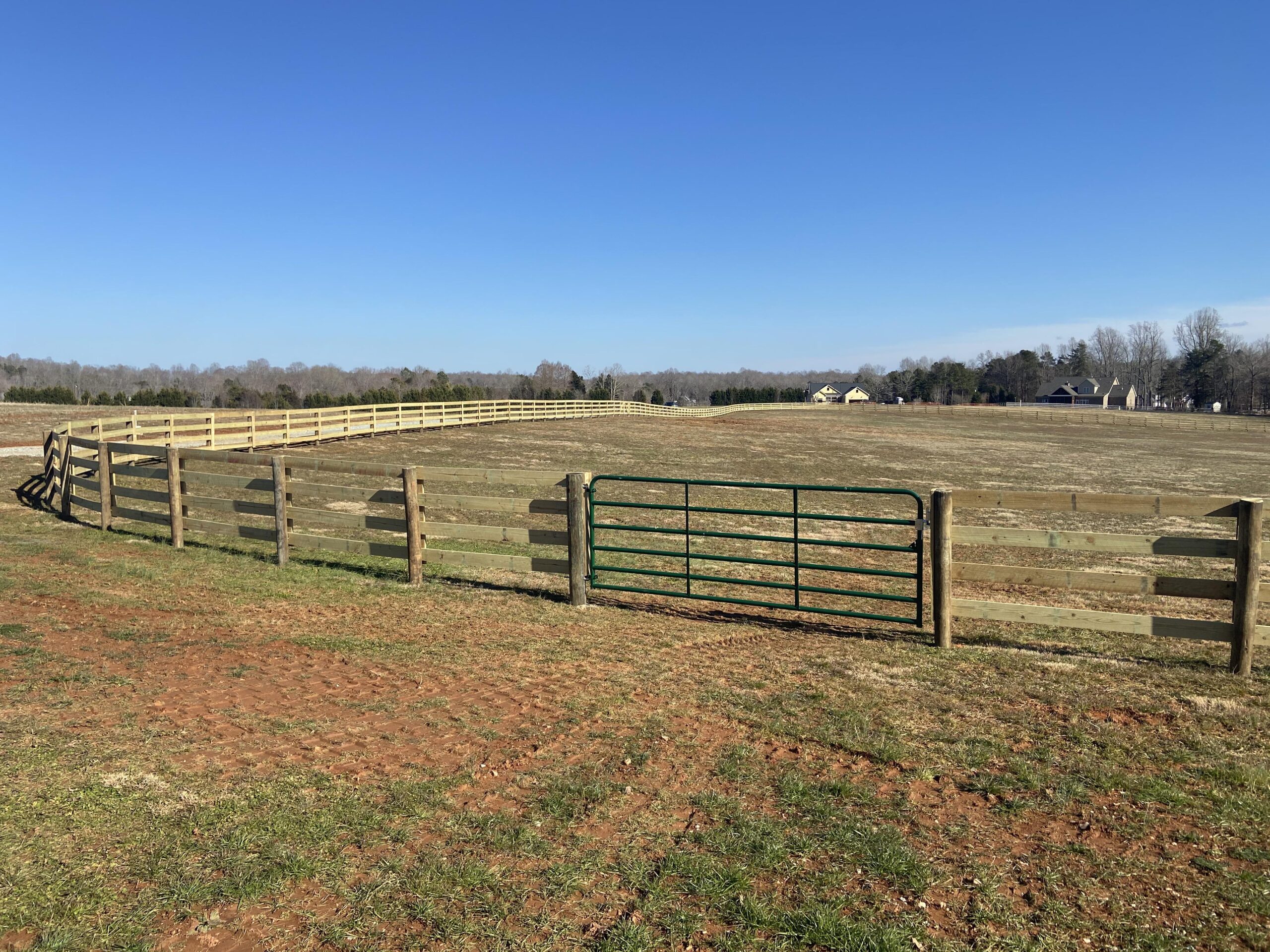 We build our fences using southern yellow pine or vinyl, in 6′ or 8′ sections, and can paint or stain them to match your property. 3-board designs offer great visibility and security for horses, while 4-board options add extra strength and enclosure without sacrificing their clean, traditional look.